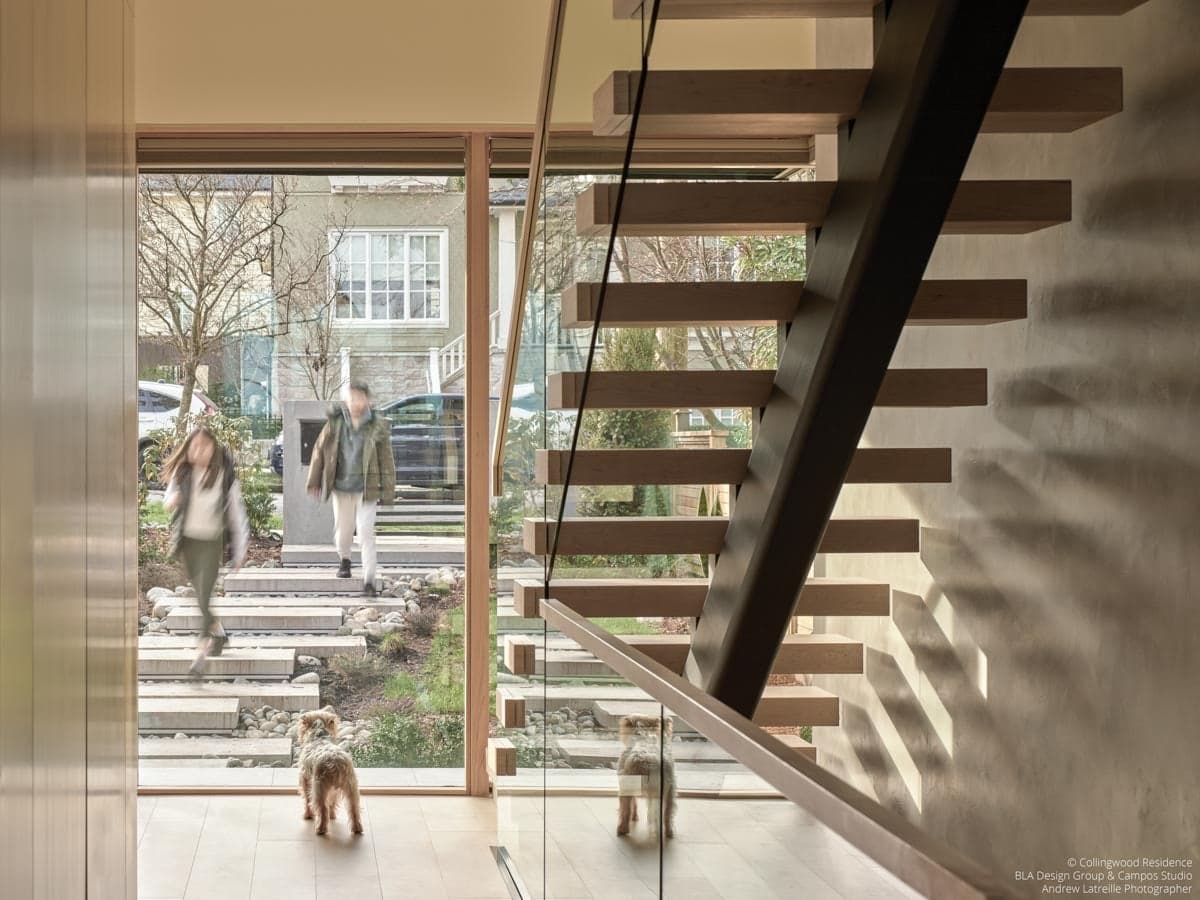 This contemporary home does not conceal its staircase, and it is all the more welcoming for it. The warm wooden stairs offer a surprise by landing right in front of a VistaLuxe WD LINE corner direct set. These windows include a maple interior, further embracing the organic texture and color.