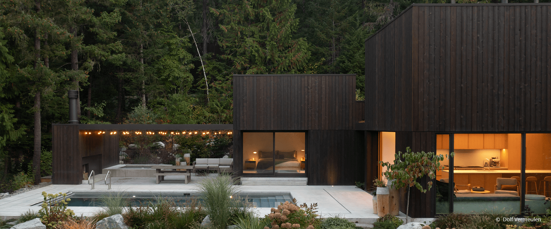 The warm familiarity of wood further redefines contemporary conventions. In this dining space, a white oak wood interior with a custom clear coat finish frames out remarkable views of a Canadian forest. The soft, organic color keeps the focus on the vibrant landscape, while the verticality of the material echoes the trees themselves.