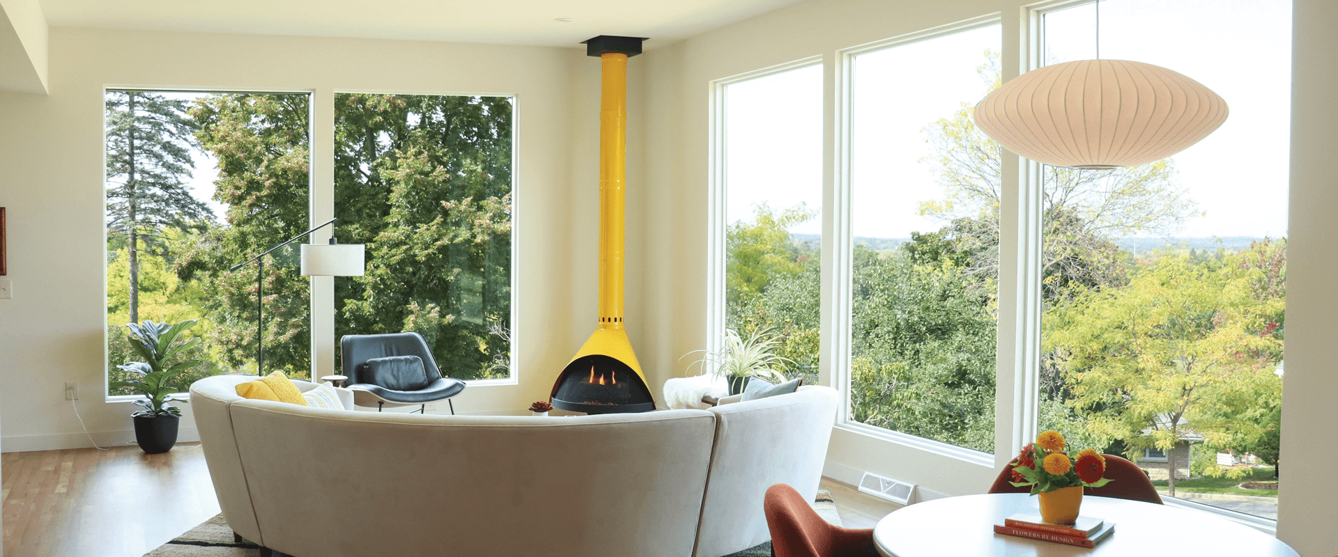 Picture windows are ubiquitous elements of Midcentury Modern living rooms. The large rectangular picture window takes its central place of honor in nearly every home of this style, often flanked by casements. Here too, clerestories or low-lying windows may be employed for panoramic views.