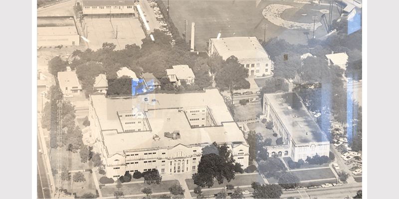 The original three-story T-shaped school was designed by Austin architect Dennis Walsh and built in 1916 by Van Horn-Shaw Construction. At the time, it was praised for its use of modern fire-resistant materials and innovative methods, such as the concrete slabs and beams that allowed the open floorplan. The tall windows illuminated the school’s interior with natural light. The operable awnings provided the building’s air circulation and ventilation.