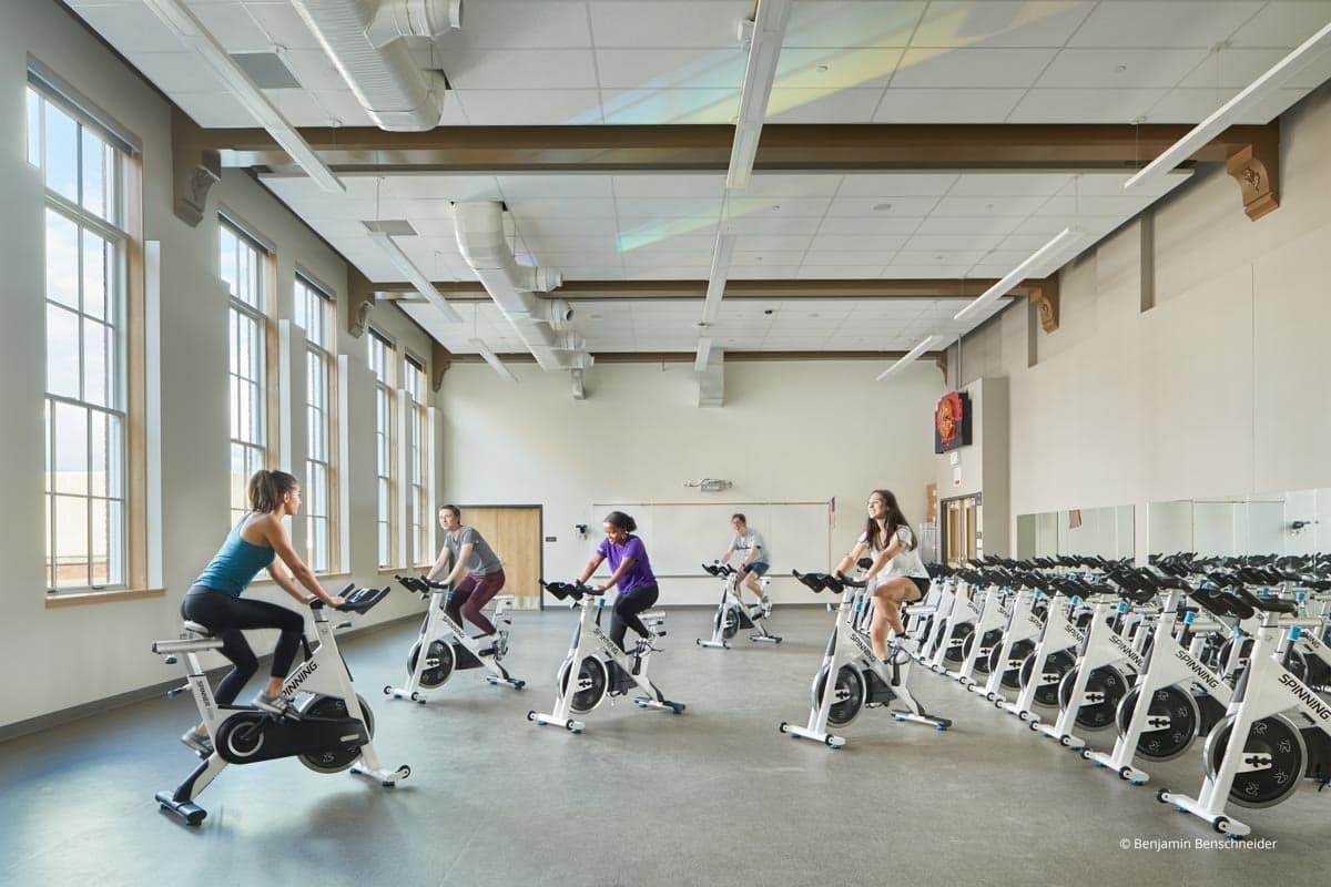 The 257,257-square-foot school’s total renovation supported both a new teacher-facilitated 21st century learning model and flexible student-centered spaces with six learning communities surrounding a central common area. Room configurations and functionality were revised, such as turning former study halls into a fitness center and a makerspace, and converting the original auditorium to a new state-of-the-art library. Below the library, the former gymnasium was transformed into large classrooms, labs, breakout areas and teacher planning spaces. The old boiler rooms were reimagined as the new commons area that defines the “heart of the school” with a secure indoor-outdoor connection to a courtyard.