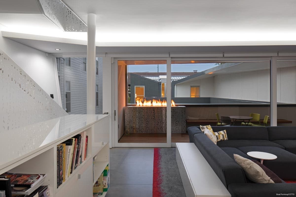 Through strategic window locations, ample light is playfully introduced to enhance the texture and patterns of the interior architecture.