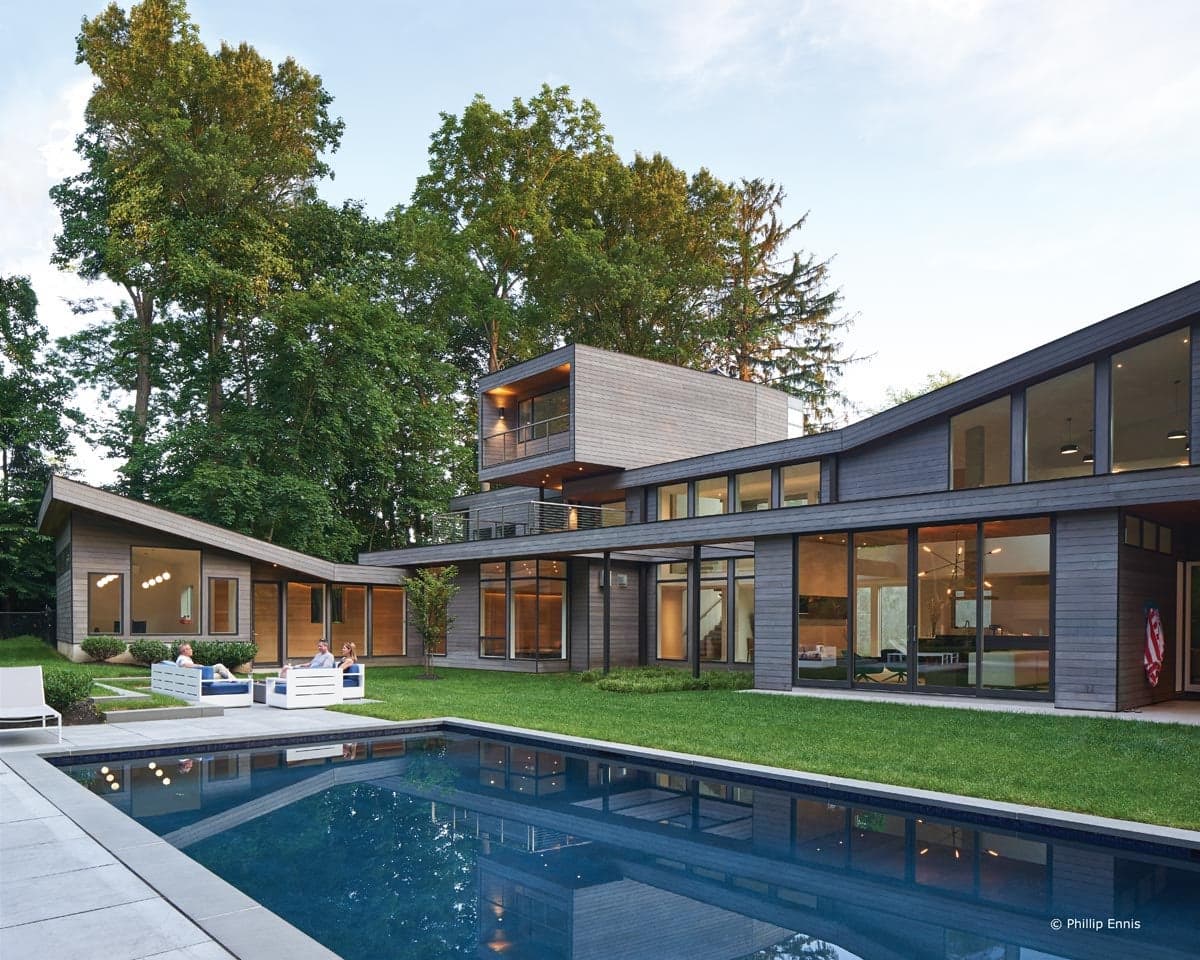 Just outside of New York City in Rumson, New Jersey, this cedar-clad, 4,000-square-foot home reads as a single story when viewed from the street. As you approach the front entrance, however, surprising design features begin to reveal themselves — including a second ground level and a striking glass-encased stair tower.