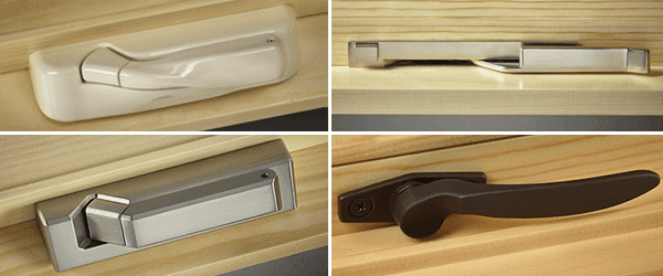 From nesting (top left) and Ashlar handles (bottom left) to low-profile Evo operators (top right), our crank-out casements and awnings have highly functional handles and locking levers in a wide variety of finishes. Push-out and inswing casement windows have lever handles that pull the sash in securely for a weather-tight seal. (Bottom right: push-out awning handle with multi-point lock.)